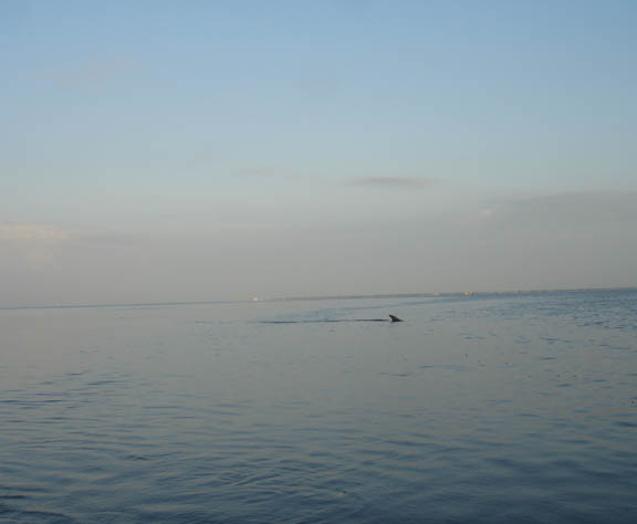 The dolphins are out early fishing for the morning meal. This is a lone bull male chasing some tasty mullet in a foot or so of water. We wonder if it is the same guy from a few weeks ago. Sometimes, they are not aware you are even there if they are excited by water full of small mullet (fish) as they hunt up breakfast. Hey, no McDonalds on the way to the drop point for an egg mcmuffin for them. Sometimes in the cool of the morning, I wished I had opted for the large coffee but half an hour later, we are sucking down water as the sun rises in the sky. At one point, he was less than six feet from our kayak this morning.