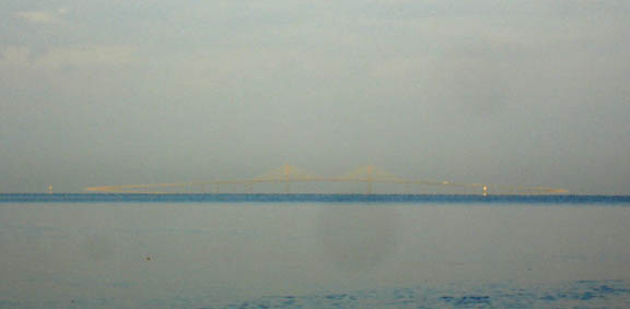 The sunshine illuminates the Sunshing Skyway bridge over Tampa Bay. It just got a new gold paint job so you can pick it out even thought it is two or three miles away.